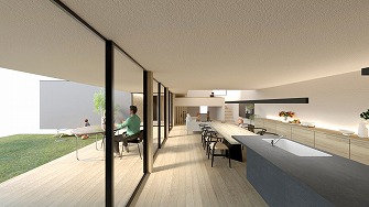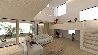 Detourを直訳すると迂回。1階から2階への動線上に迂回するようにスタディスペースを計画し、遠回りで進みながら公園の借景を感じ空間の広がりのある住まいです。
