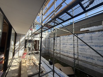 現在は中庭部分の仕上げ工事が進行中で、左官屋さんがコテを使い丁寧に下塗りを行っていました。