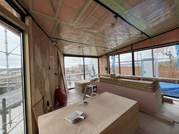 内部の木工事が進んで各種ボードを貼ってました。