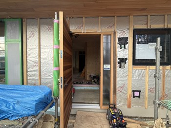 外部では、軒天にマホガニー材が張られ、木製ドアの取付も完了しています。