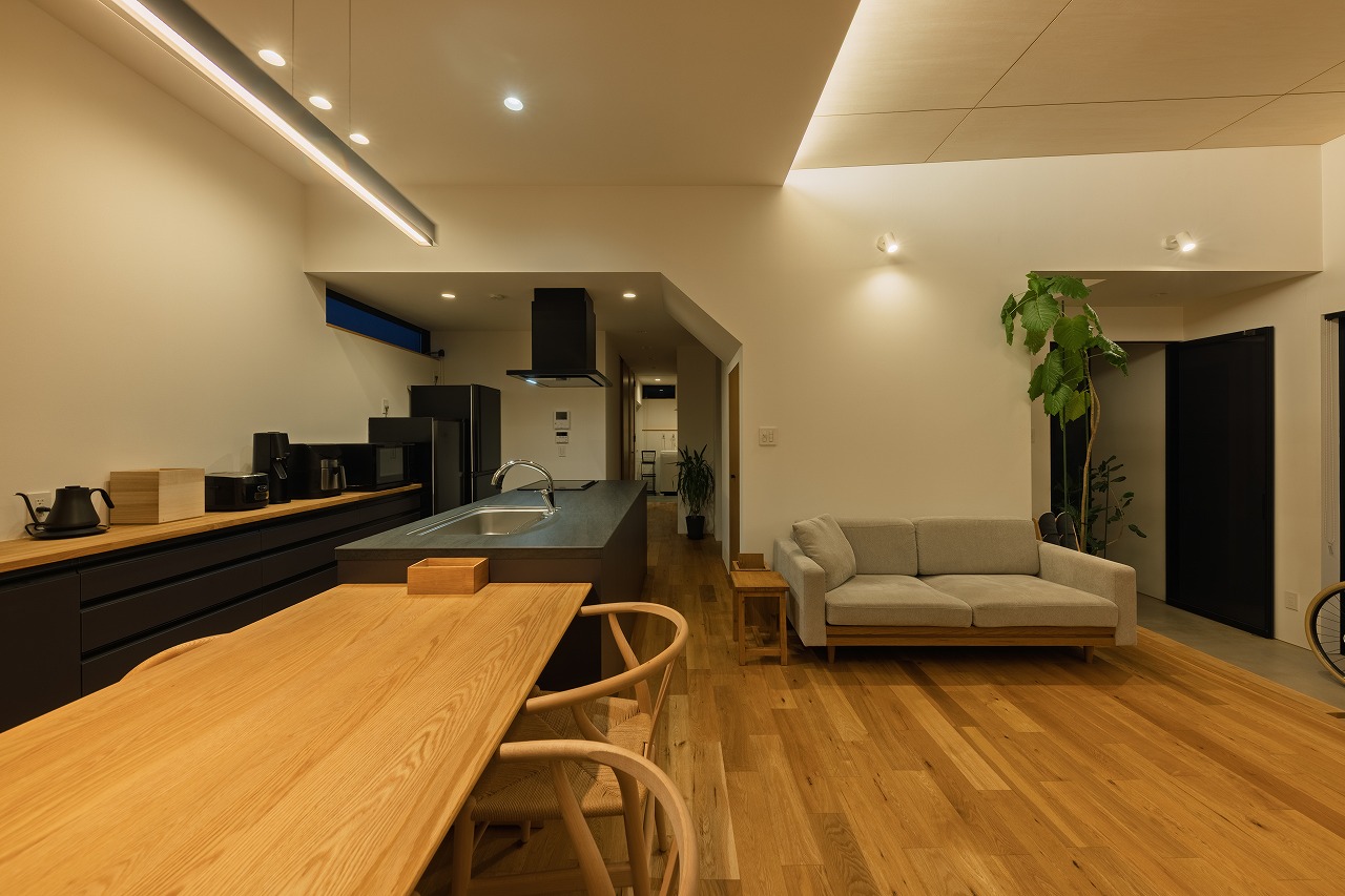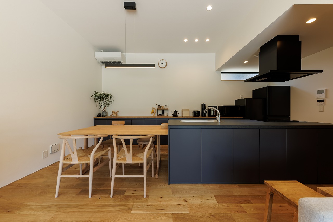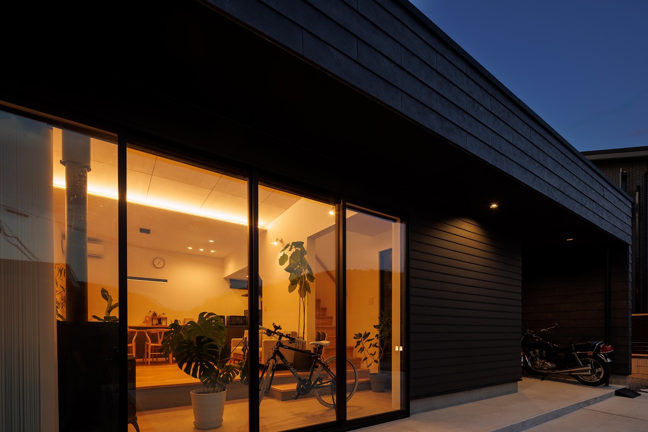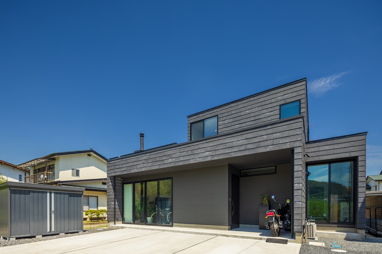 外観はブラックを基調とし、内部はナチュラルな素材感でまとめることで、対比のある落ち着いた住空間を実現しました。