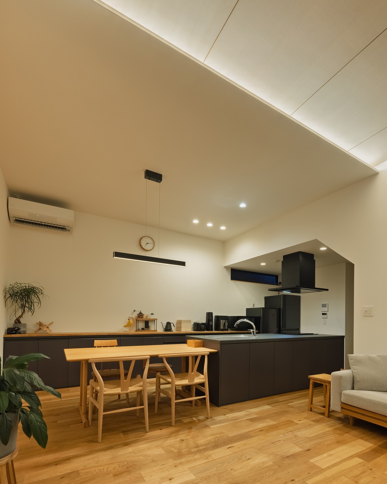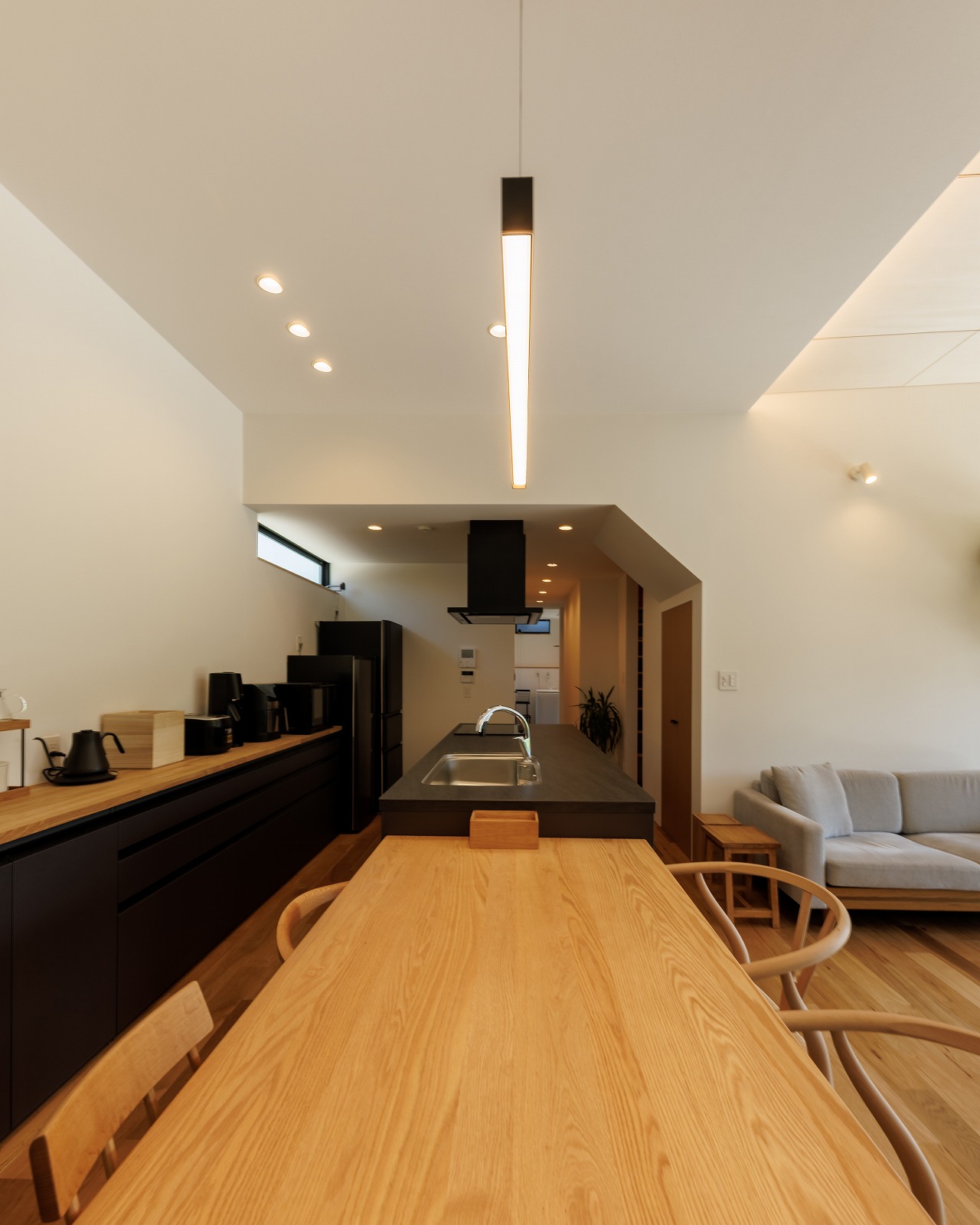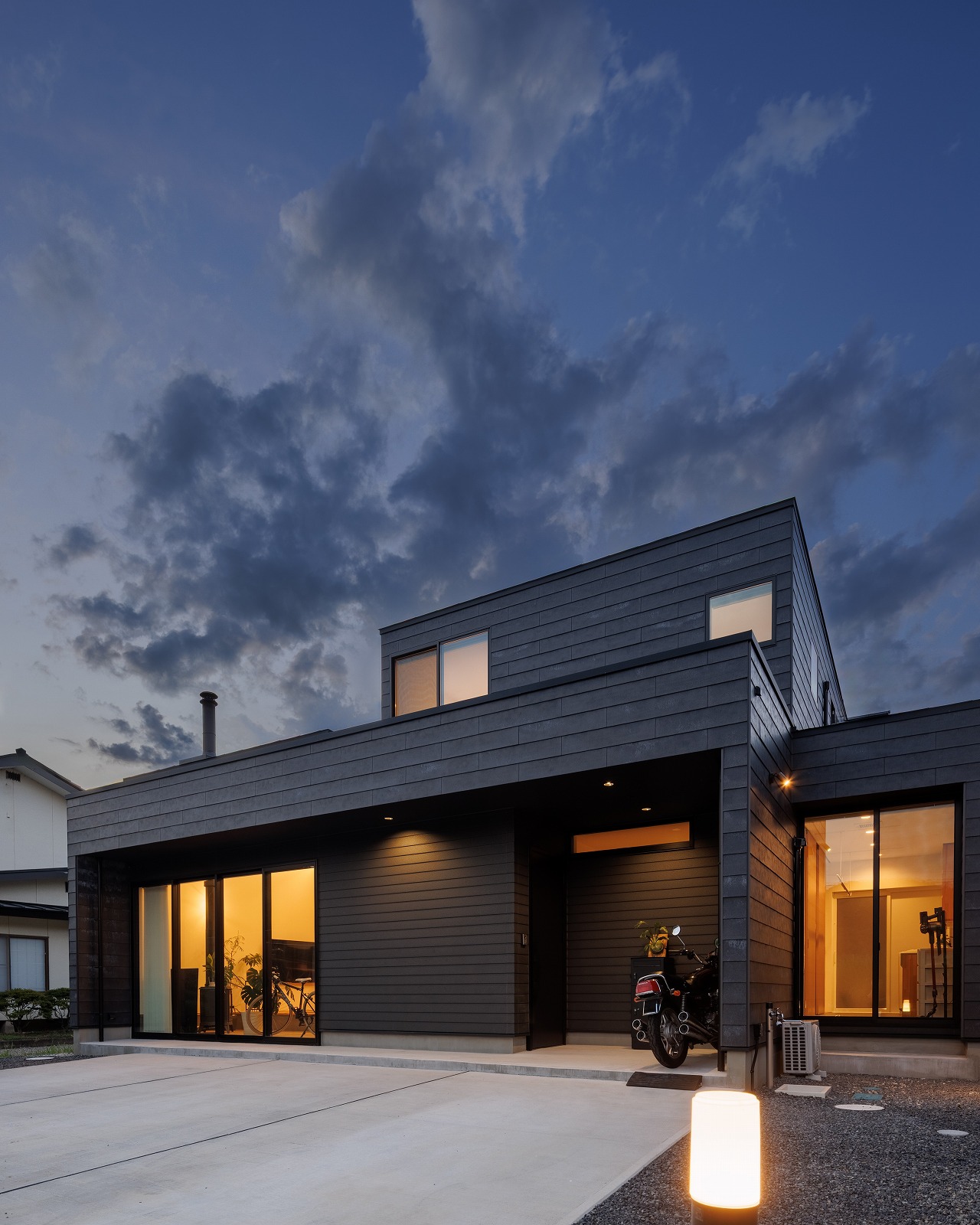 外観はブラックを基調とし、内部はナチュラルな素材感でまとめることで、対比のある落ち着いた住空間を実現しました。