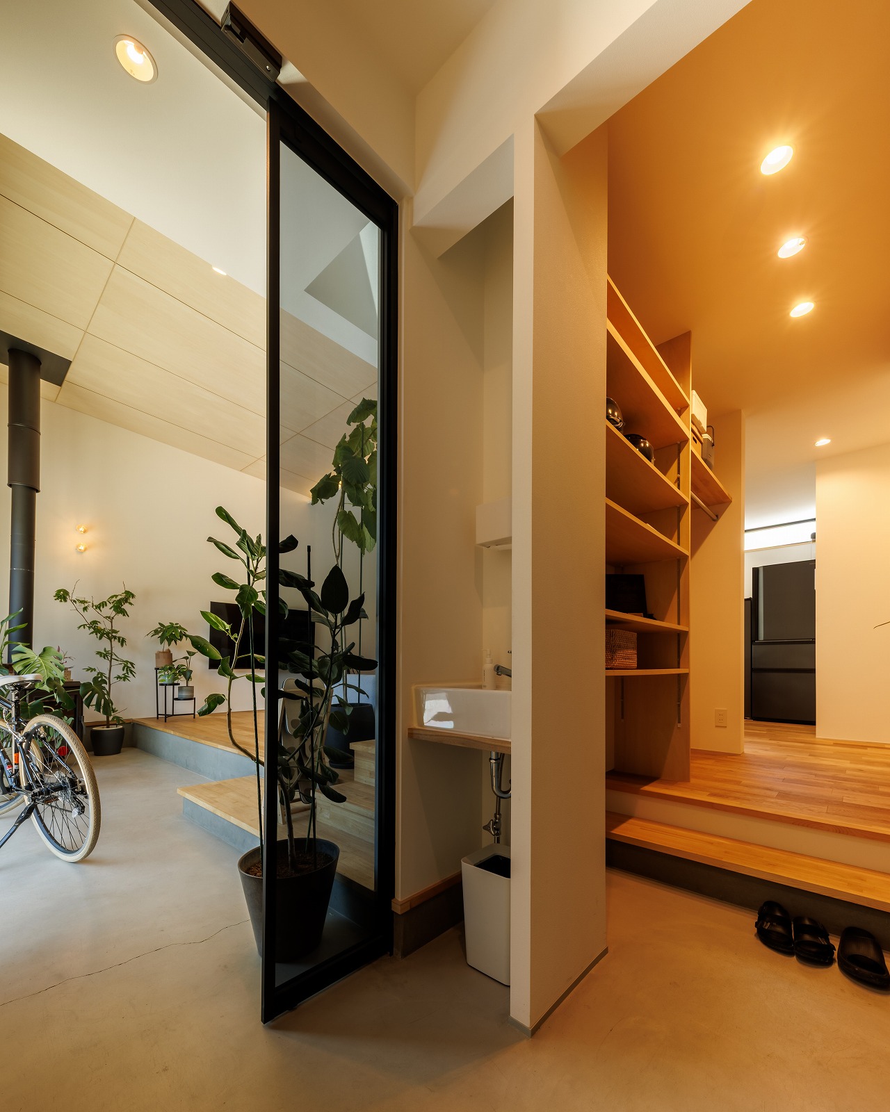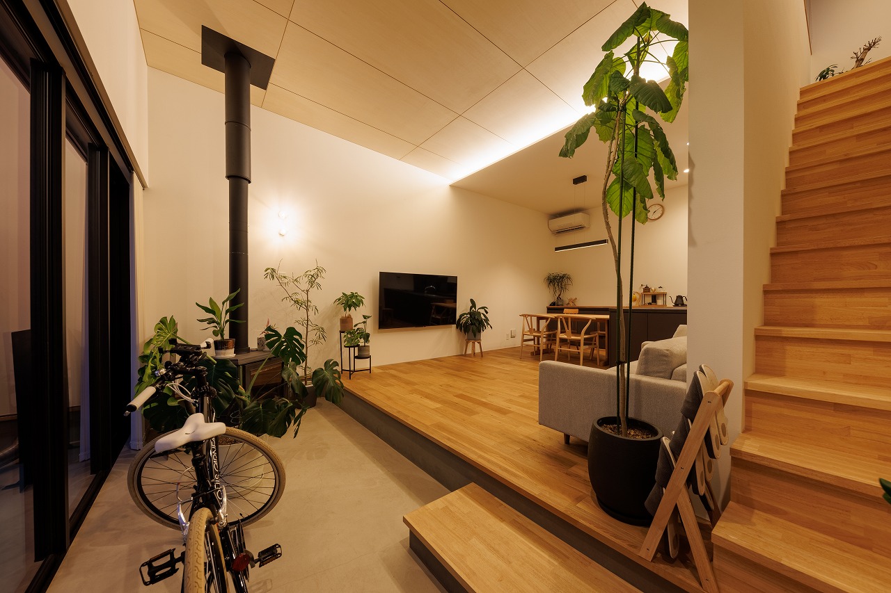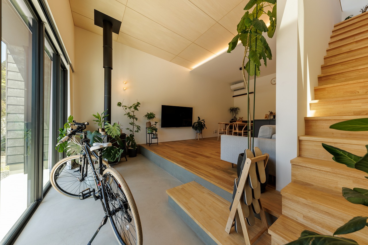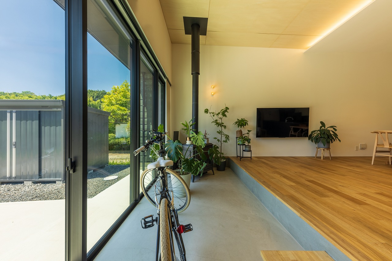 開口部からは土間スペース(土縁)が外部へと延長し、室内のリビングにまでつながっています。その一角には薪ストーブを設置し、土足のまま楽しめる空間としました。土縁は外と内をつなぐ場であると同時に、冬は日差しを受けて蓄熱し、夏はコンクリートのひんやりとした質感が心地よい温熱環境をつくり出すスペースにもなっています。