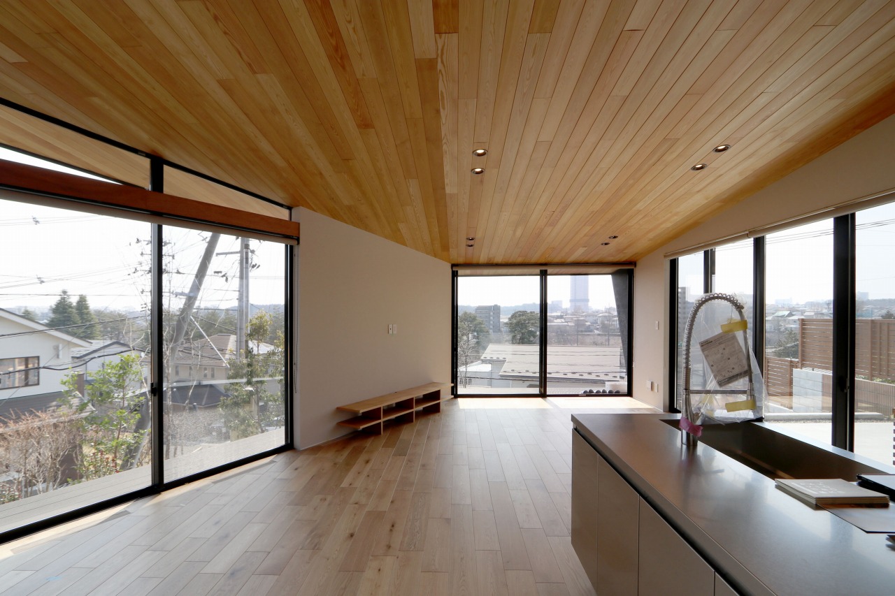 敷地は崖の上に位置し、遠くまで視線が抜ける眺望と大きな空を感じられる環境にあります。この立地の魅力を活かすため、住