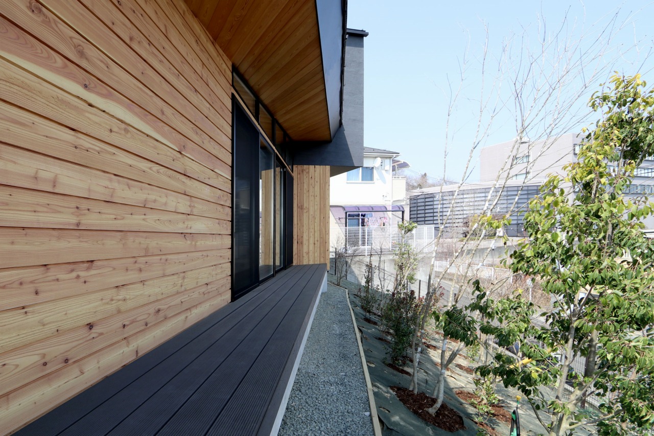 外観は、2階をグレーのジョリパット仕上げ、1階を木板張りとすることで、モダンな印象の中に自然素材の温かみを取り入れ