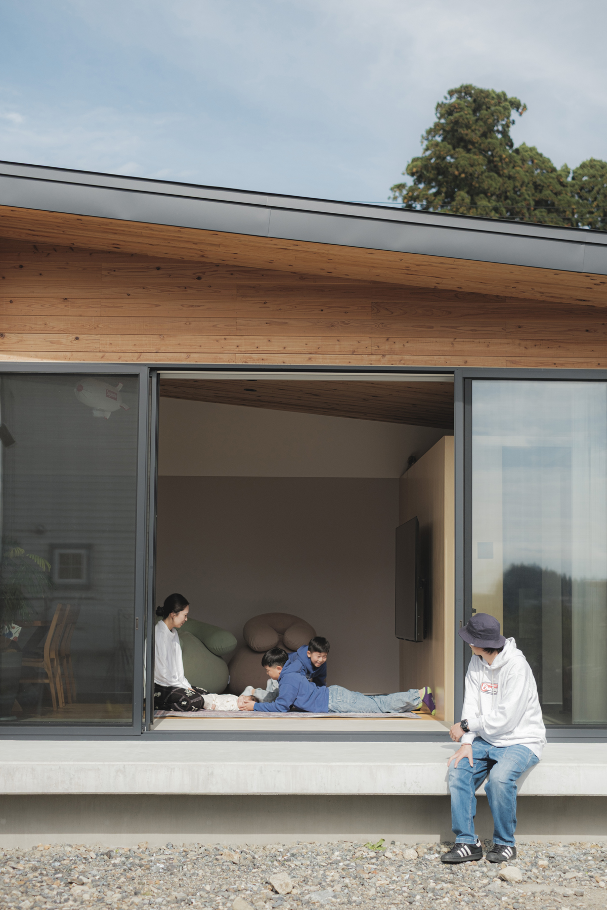 勾配屋根のリビングに内と外をつなぐ縁側の役割をしてくれる土間がある家です。