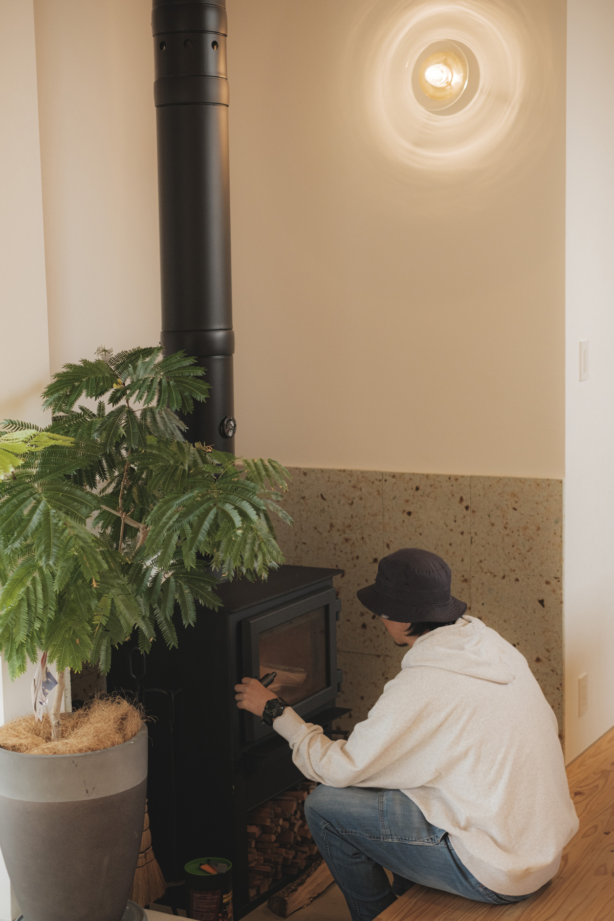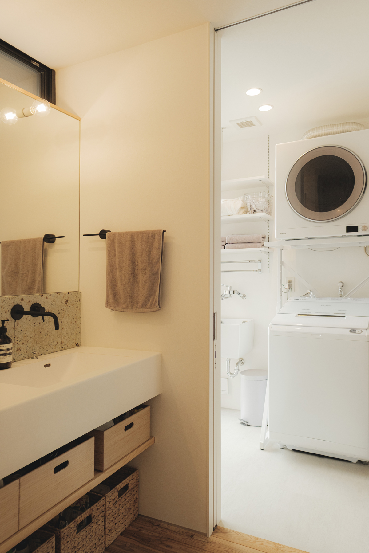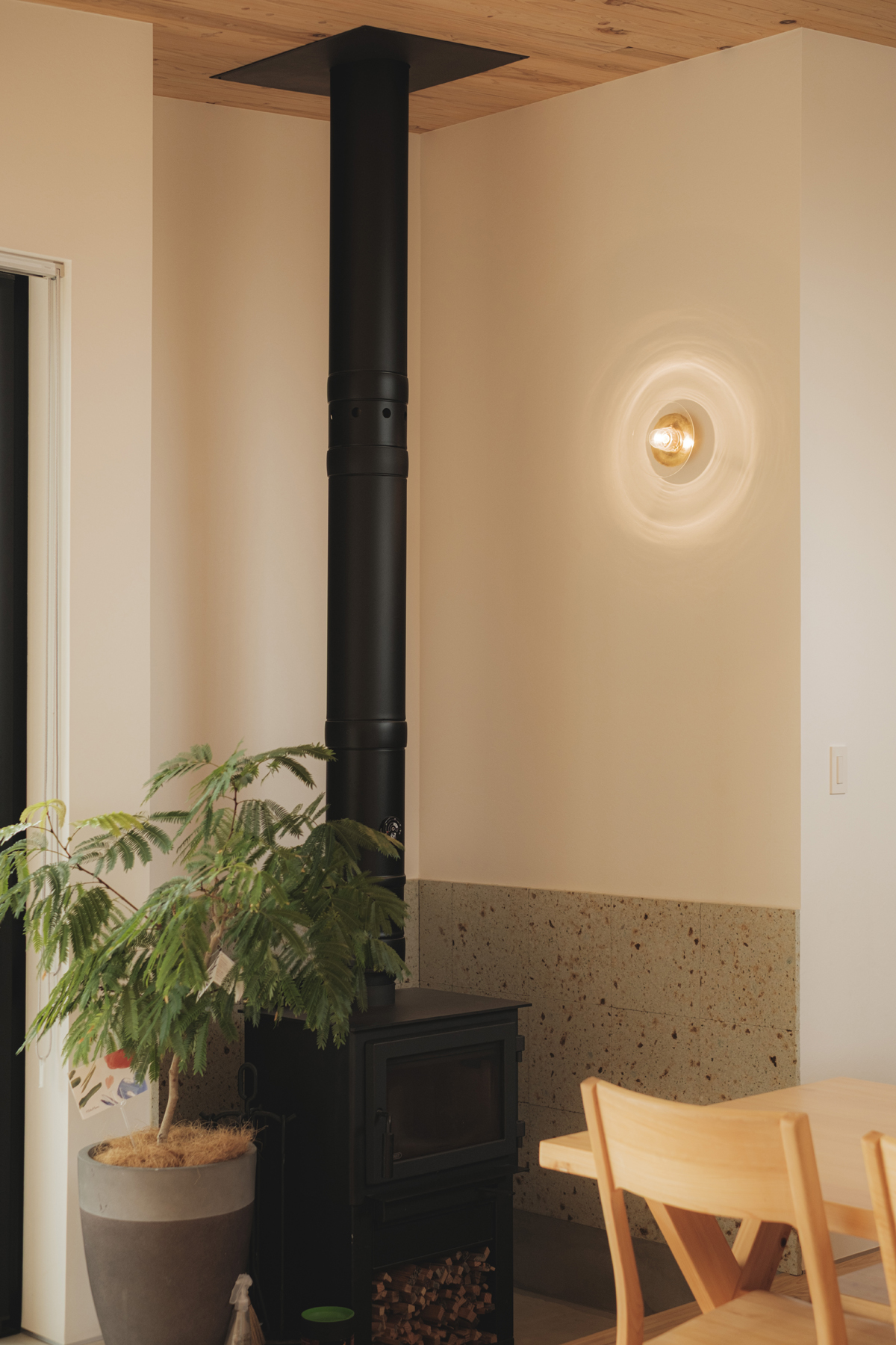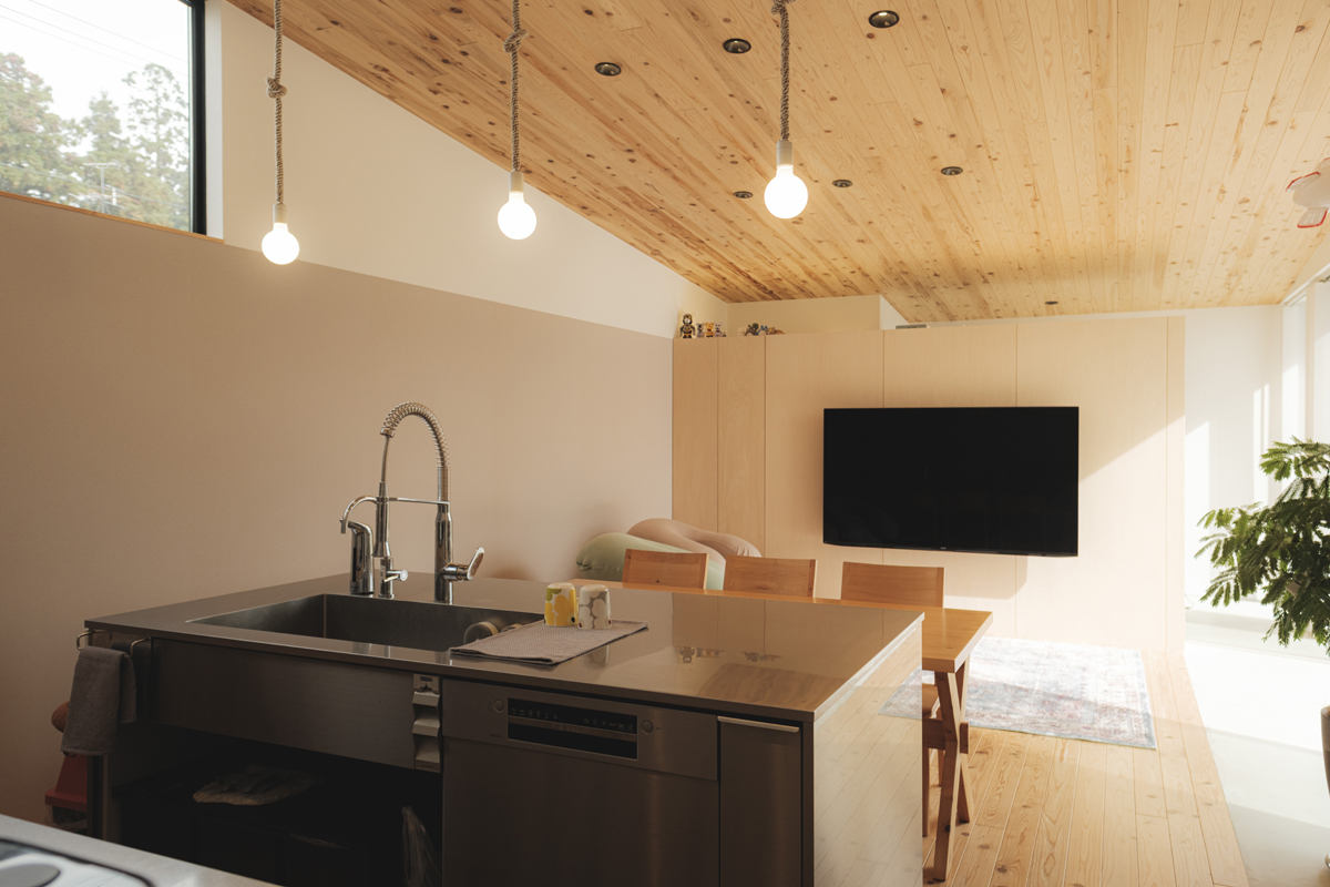 仕上げはリビングや外壁に採用した屋久島地杉のほかにも薪トーブ置き場や洗面に採用したの大谷石、コンクリート素地の土間、合板を利用したシューズクロークなど、素材そのものの魅力を味わえるよう質感を大切にした仕上げ選びを行いました。のびのびとしたリビング空間と必要十分なプライベートスペースを30坪のコンパクトな間取りに凝縮しました。