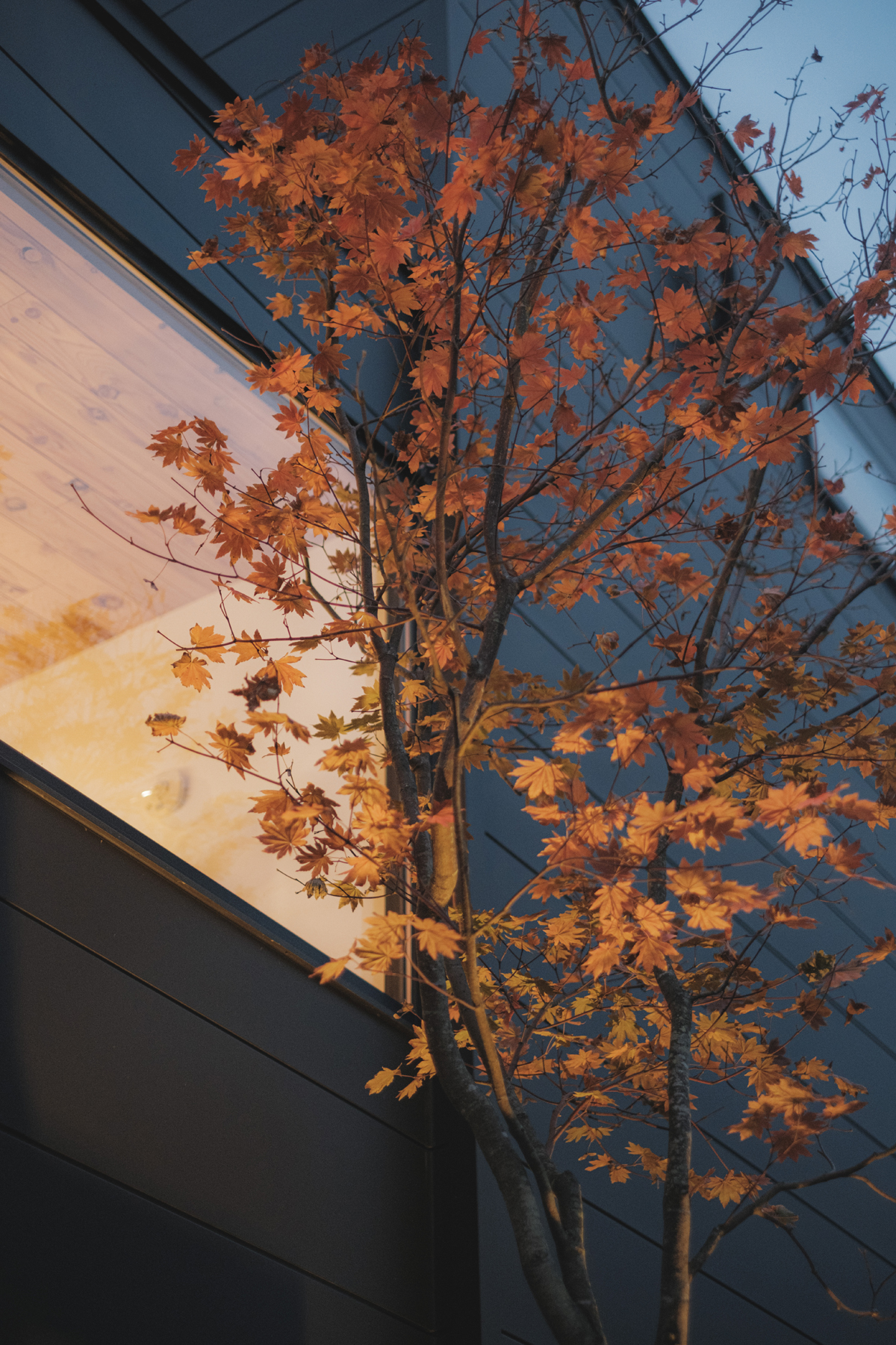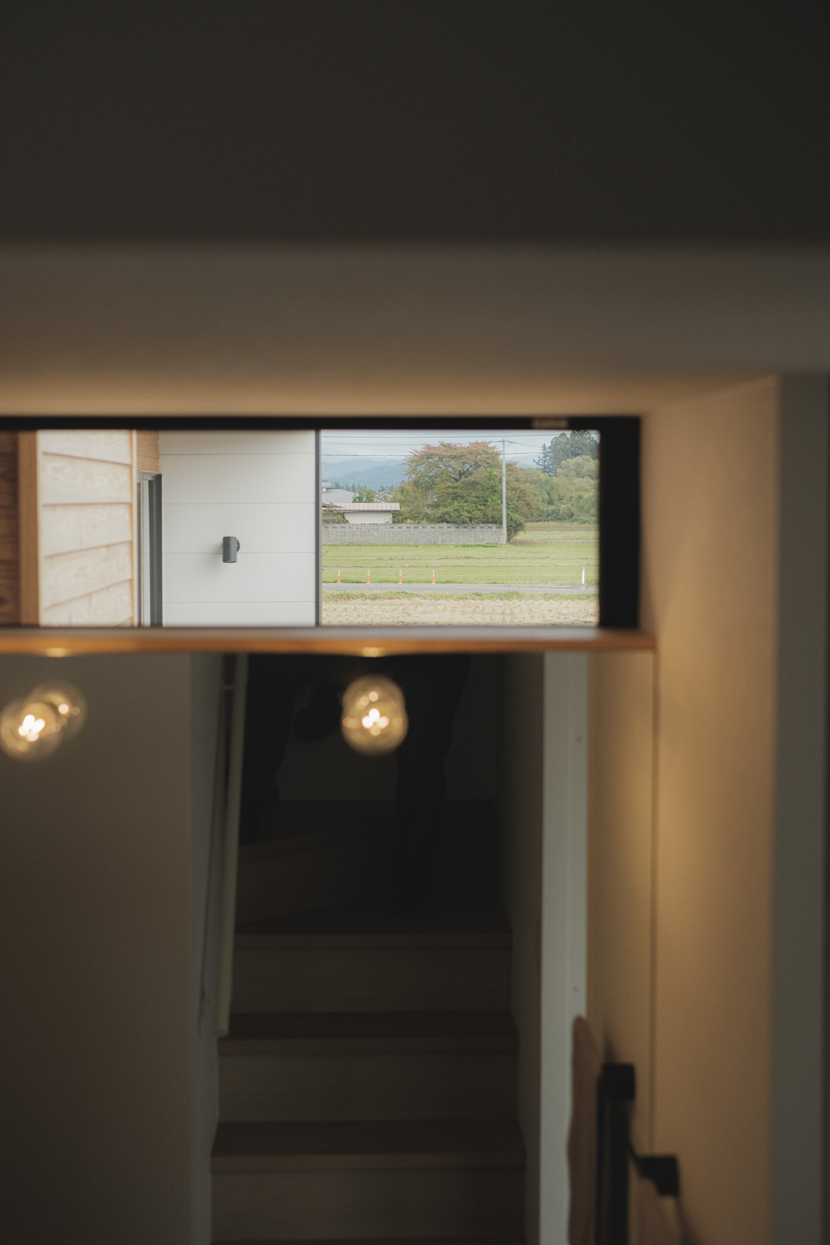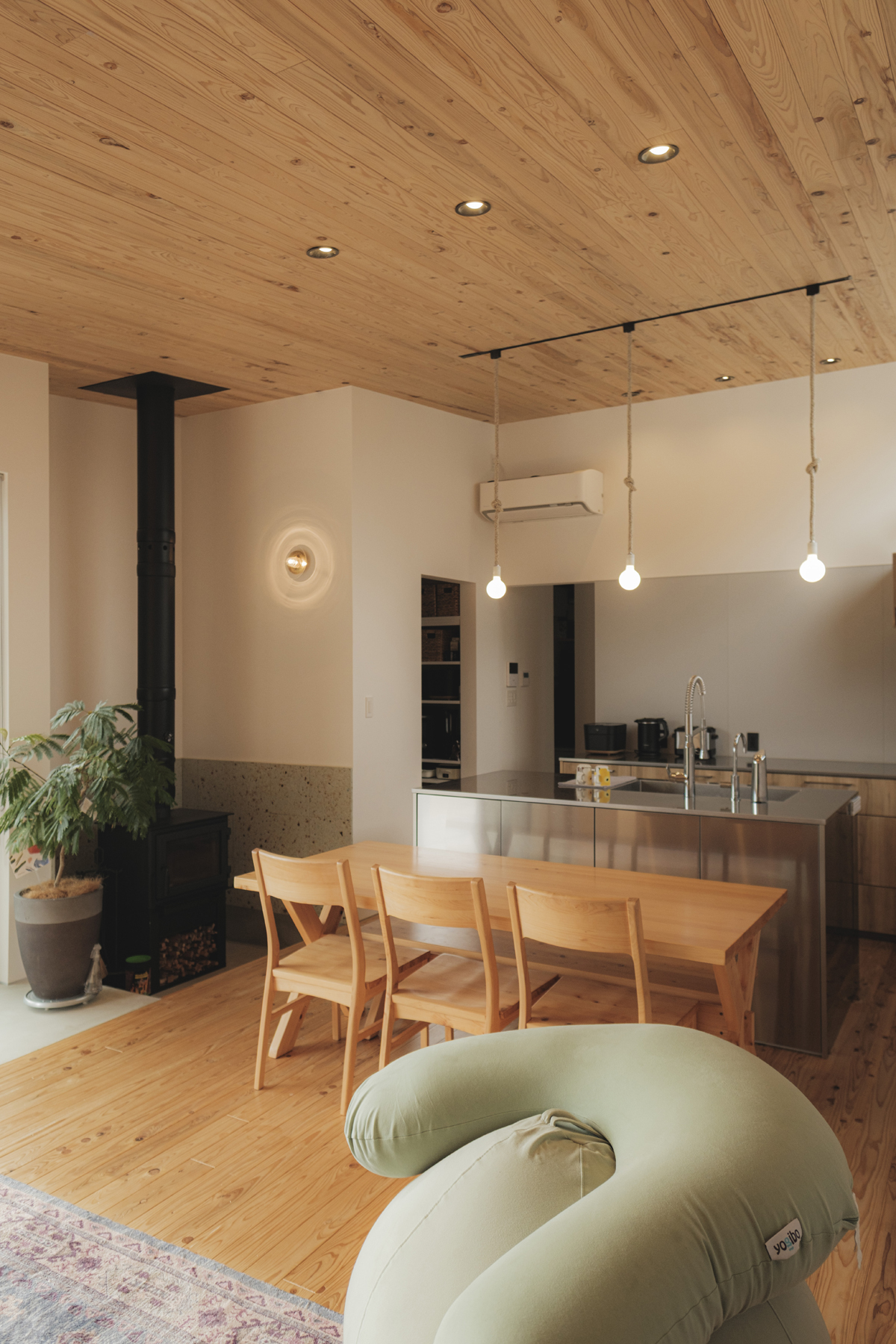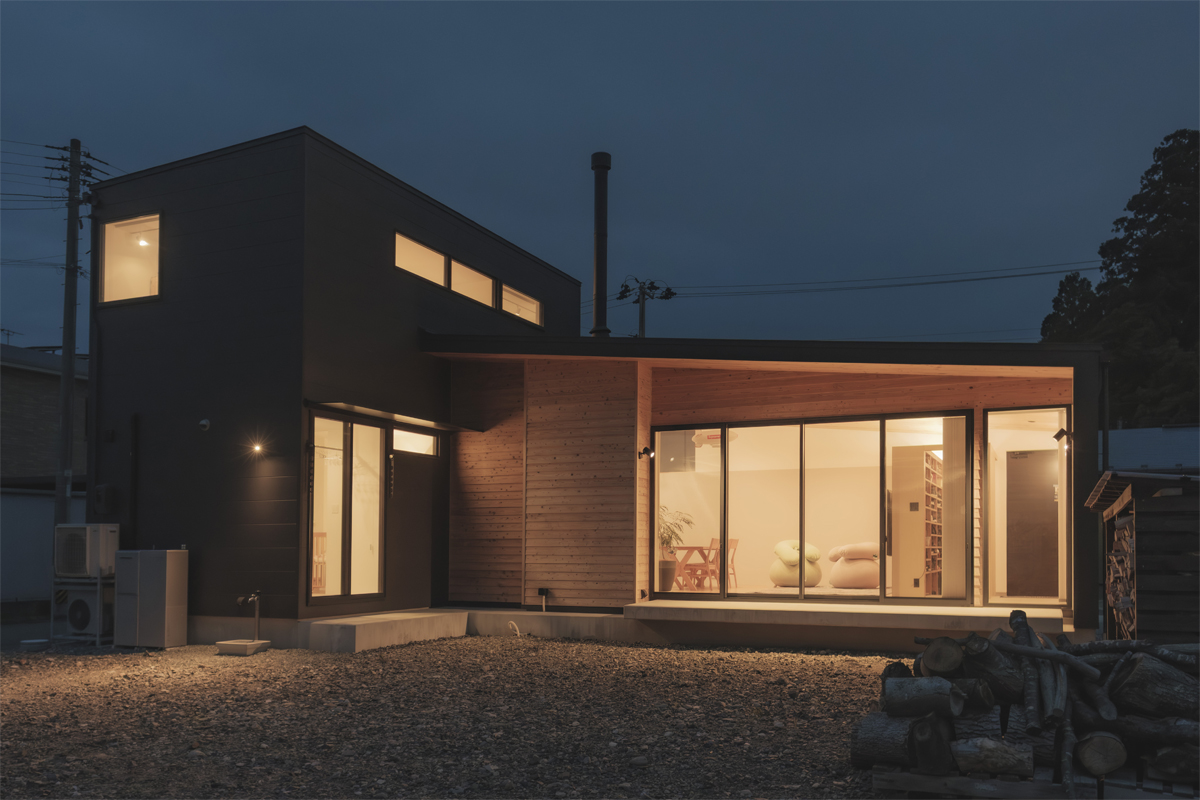 計画地はゆったりと130坪あり、東側に田んぼと遠くに川が望める開けた敷地でした。敷地内の余白の庭とその先の風景を受け止めるL型の形をベースに、家族の個室や暮らしの機能をコンパクトにまとめた2階建てのボリュームと、緩やかな勾配屋根で天井高を確保した平屋の玄関からリビングまでのボリュームとをL形の「縁側土間」がつなぎます。土間はリビング内にも続き、薪ストーブ置き場のピットまで連続し、その先のリビングはシューズクローク・玄関へと天井が一続きの大空間。天井と床には屋久島地杉の柔らかくも赤みの混ざった味のある表情が印象的です。