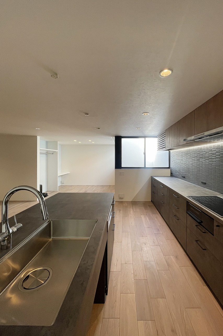 大きな壁を大判のタイルで彩り迫力のある空間となっています。床材はグレー調で統一させる中で、各部屋の特徴を表すよ