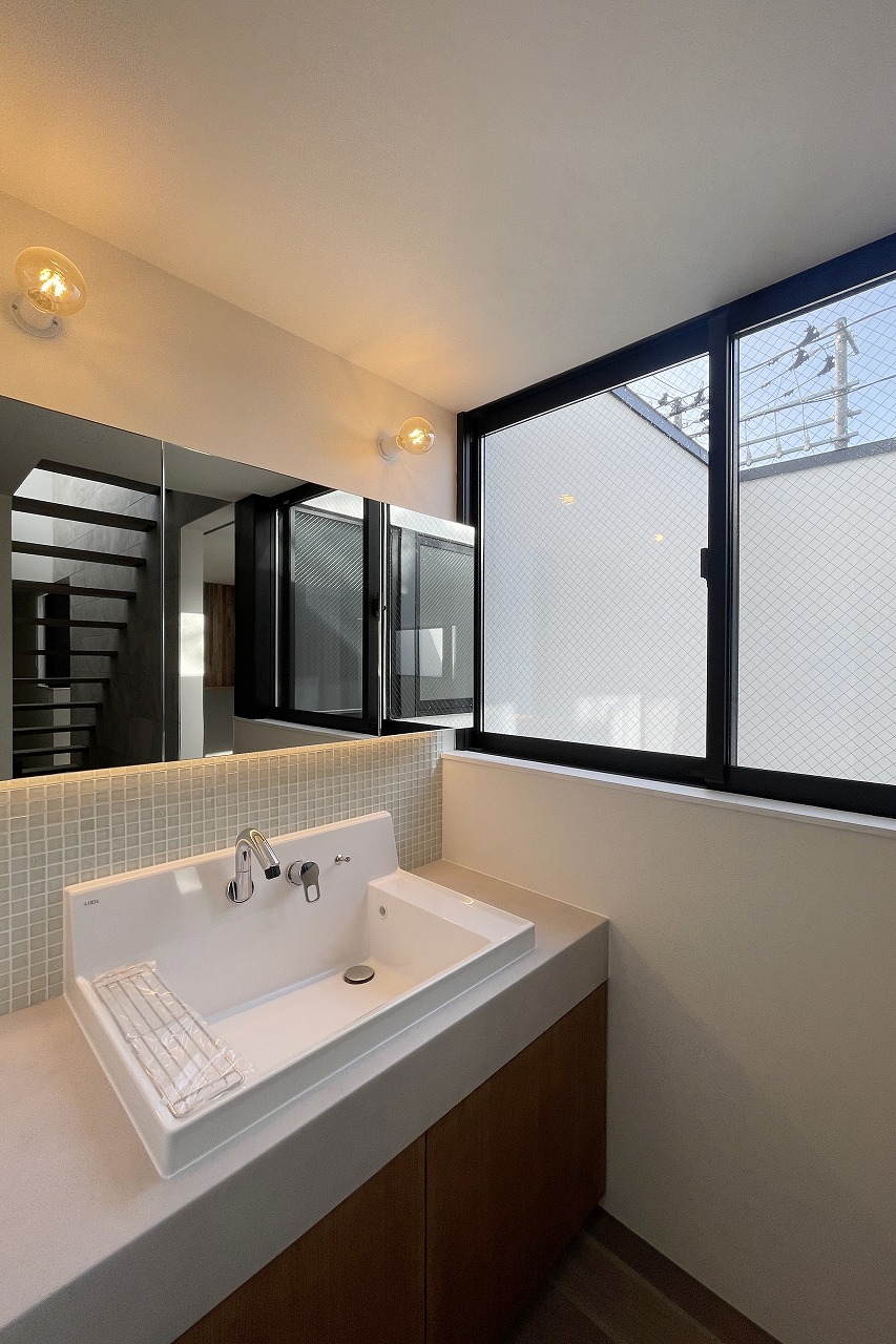2方向道路に面していることから、外からの視線を遮るよう建物外周部には窓を設けず、三隅に設けられた3つの庭から