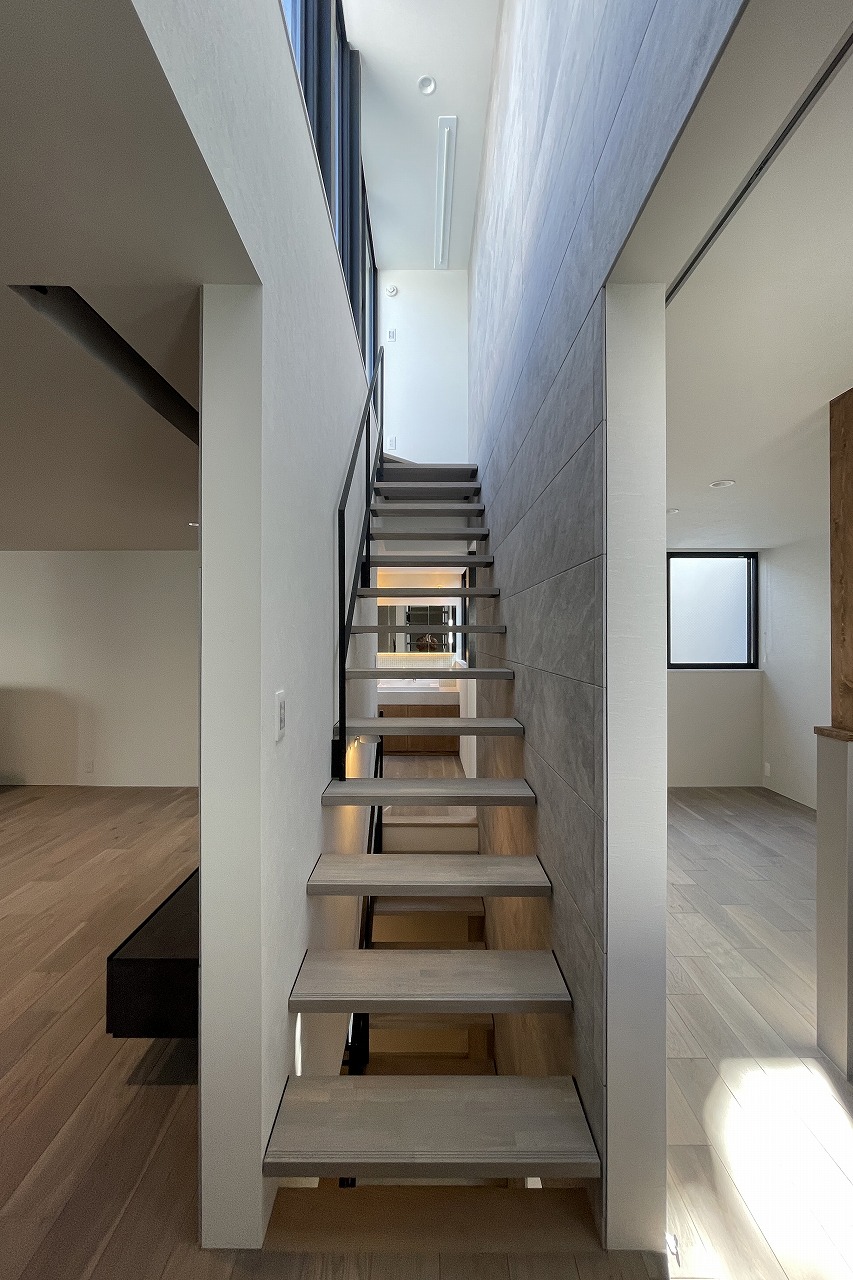玄関を入ると石目のタイルが貼られている壁が目に入ります。塔屋まで続いている階段により3階分の高さがある1枚の