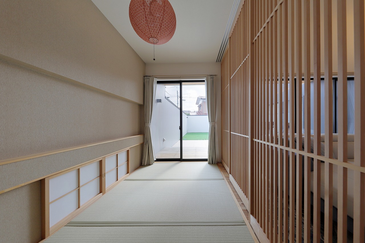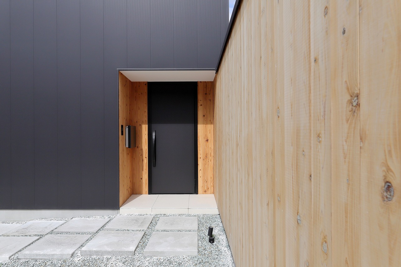 玄関から入ると、土足のまま行き来できる玄関土間と中庭のテラスにタイルが同様に続いており、ウチとソトを繋ぐ空間に連続性を与えます。また連続するタイルが、室内へと引き込まれることで、窓の光が床に沿って引き込まれ、玄関土間空間を中庭の光によって照らしています。