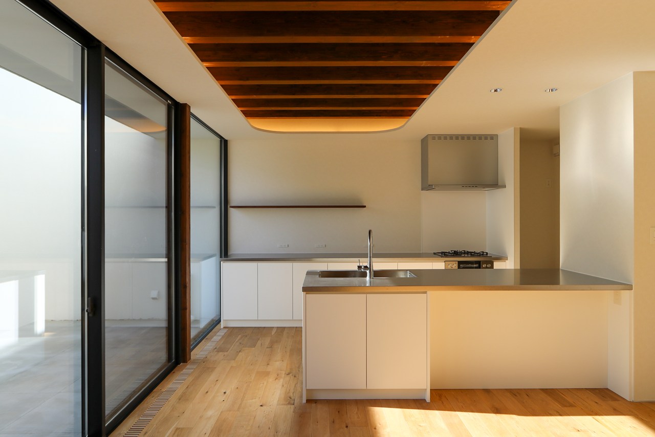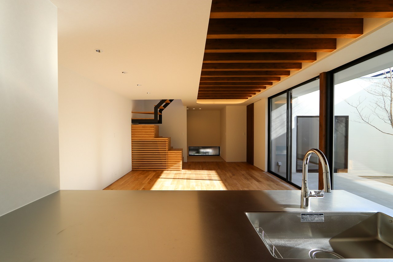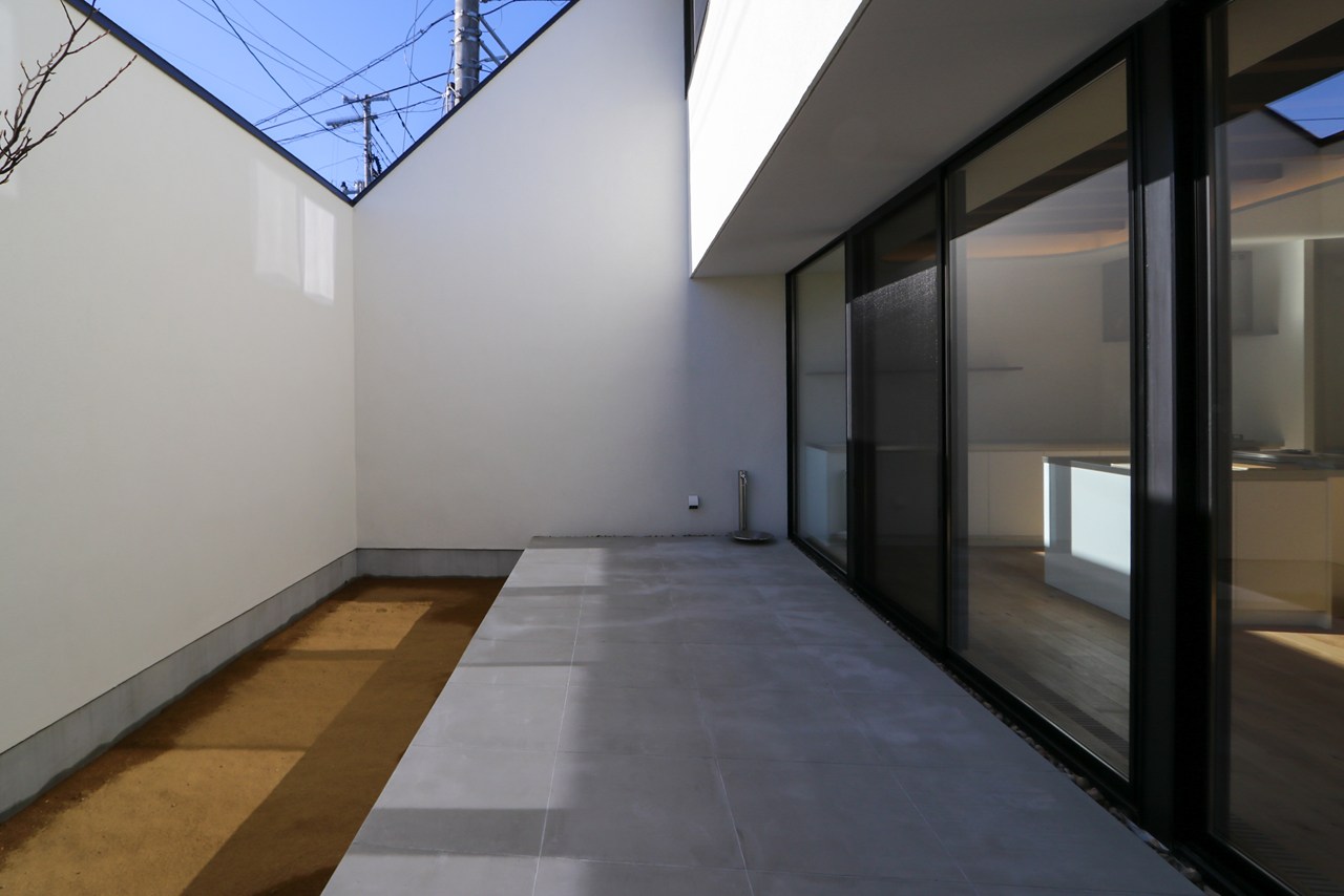 LDKの窓を開放したときは内外がひとつの“間”としてつながり、閉じたときは中庭に光が溜り、その中で光が淡く行き交う場が住まいの中心となる。