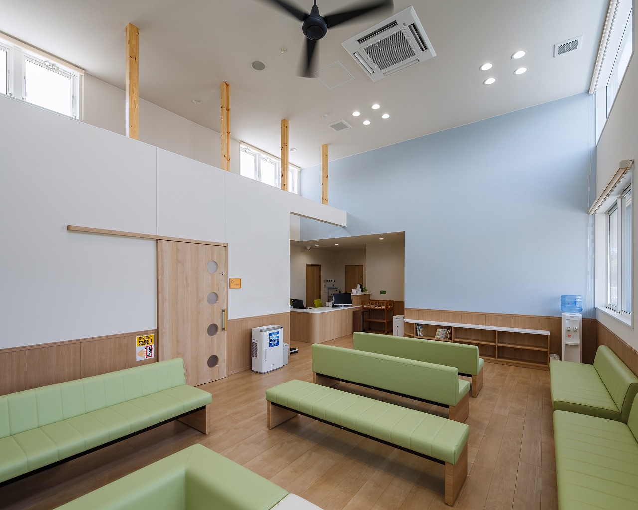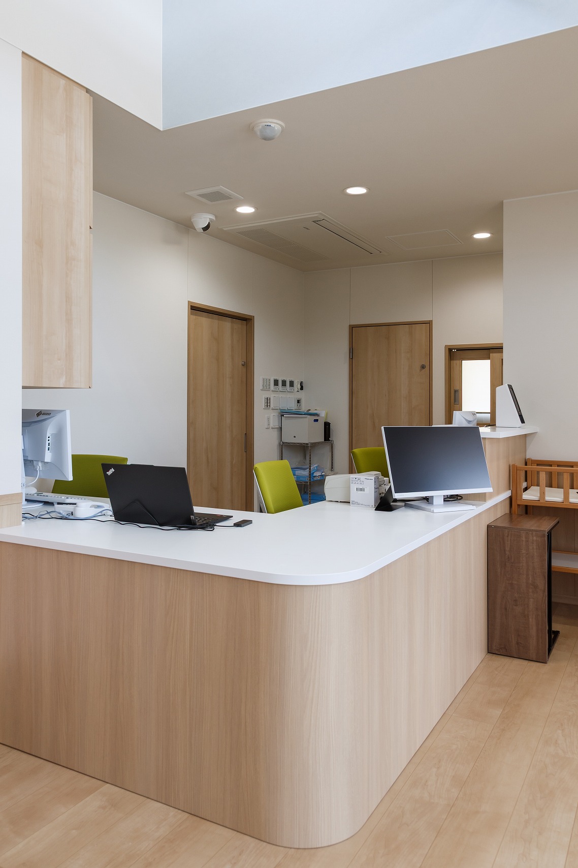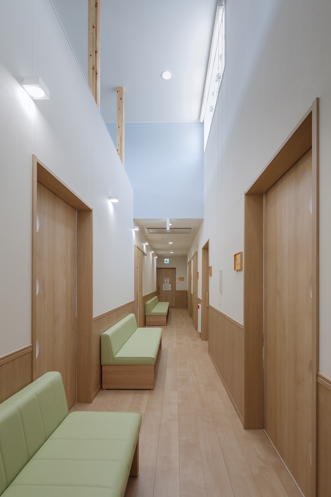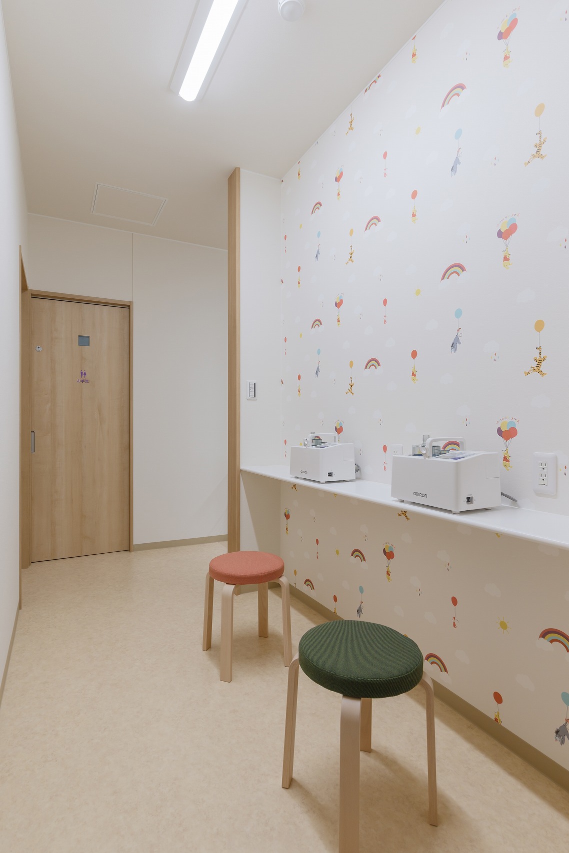 内部には診察室に加え、感染症対応のための隔離室を配置し、機能性にも配慮しています。外観はモノトーンでシンプルにまとめ、内部は子どもや保護者が安心できる柔らかな色調でコーディネートしています。