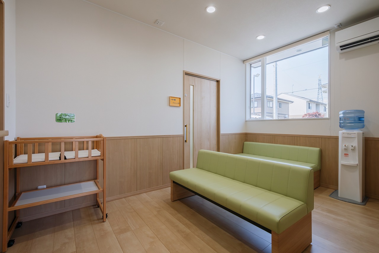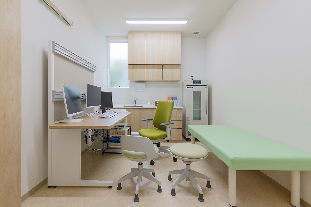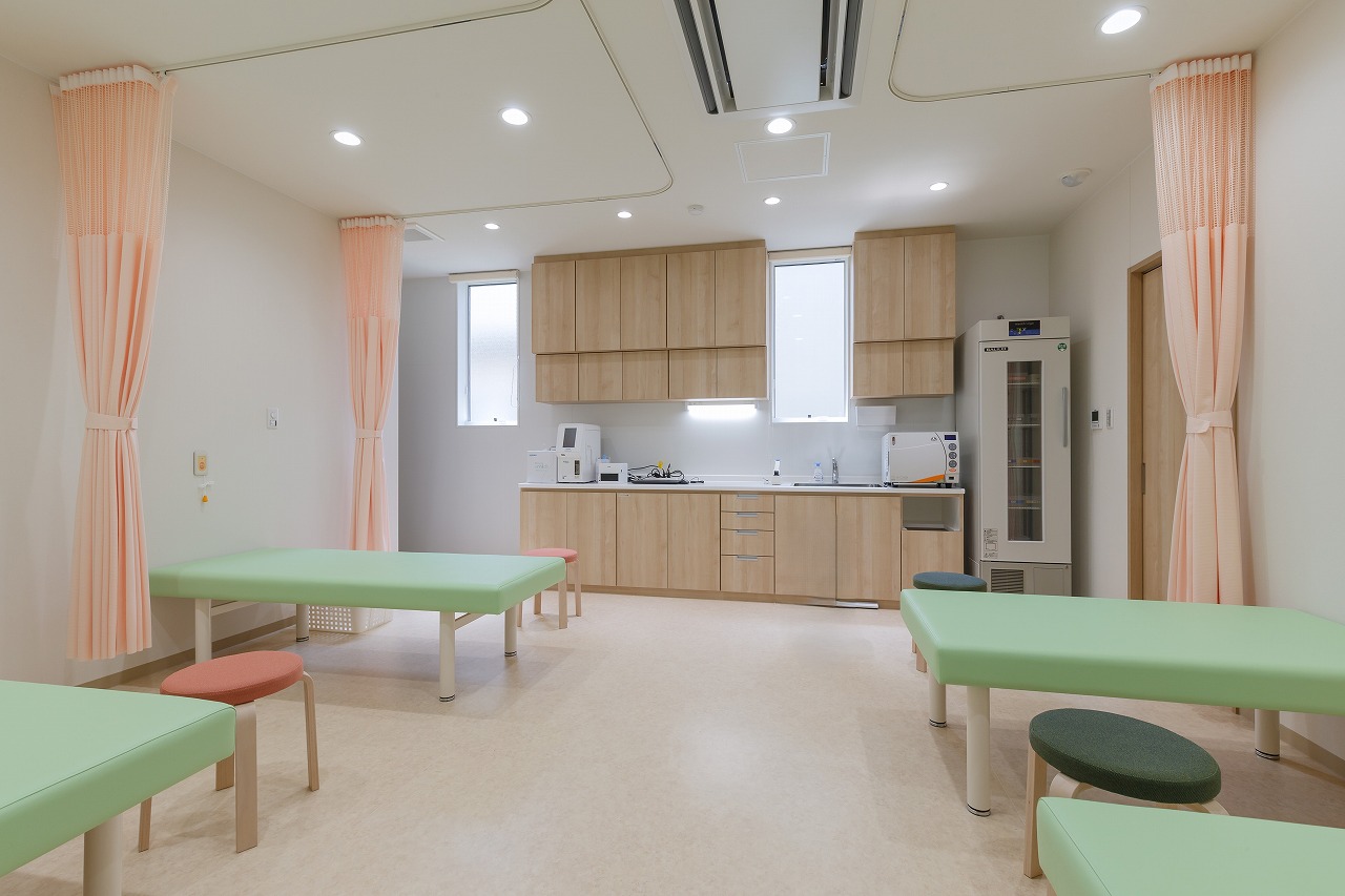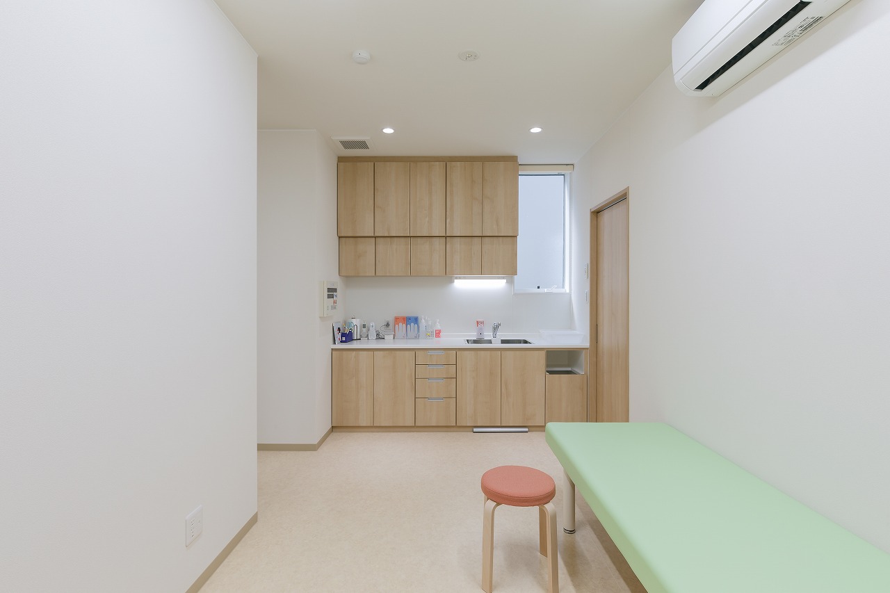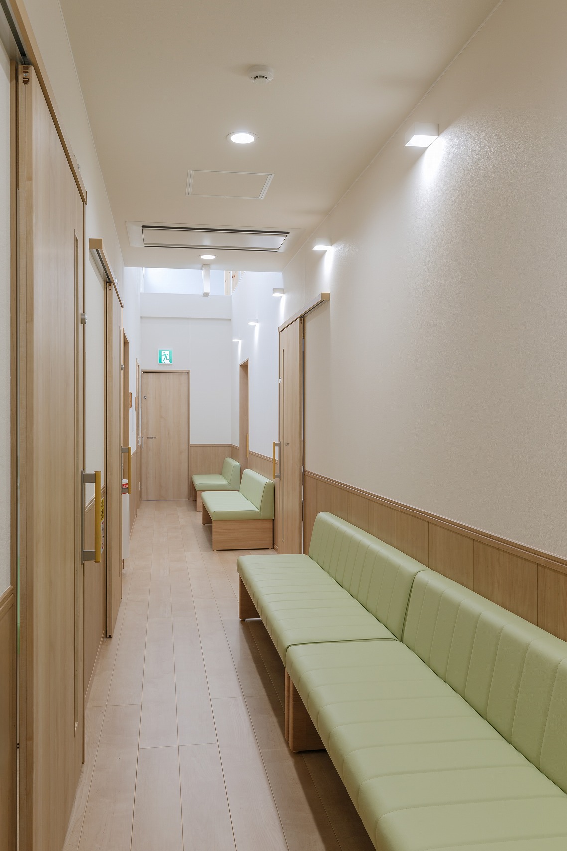 内部には診察室に加え、感染症対応のための隔離室を配置し、機能性にも配慮しています。外観はモノトーンでシンプルにまとめ、内部は子どもや保護者が安心できる柔らかな色調でコーディネートしています。