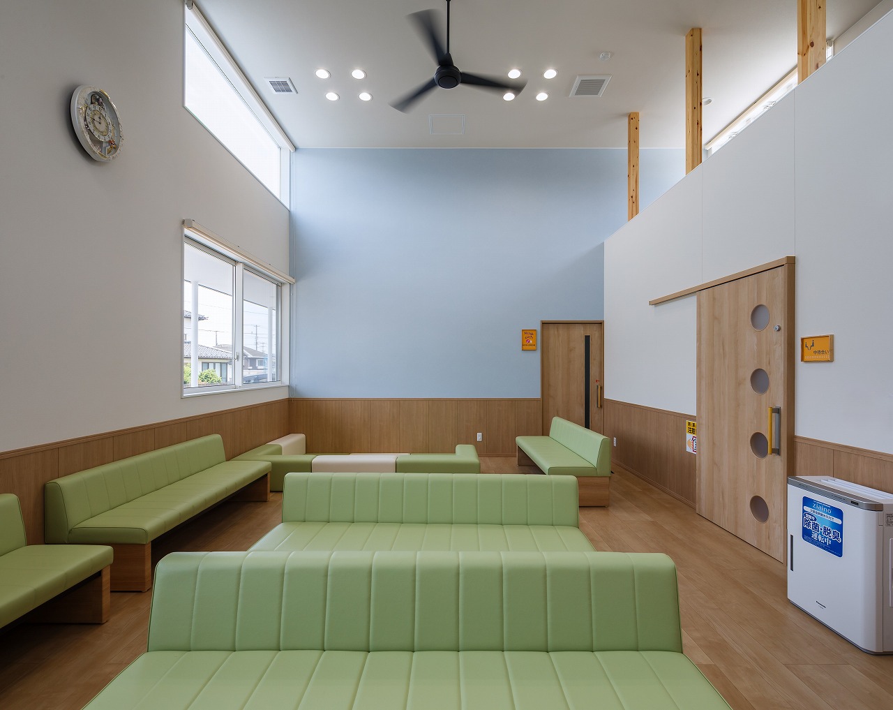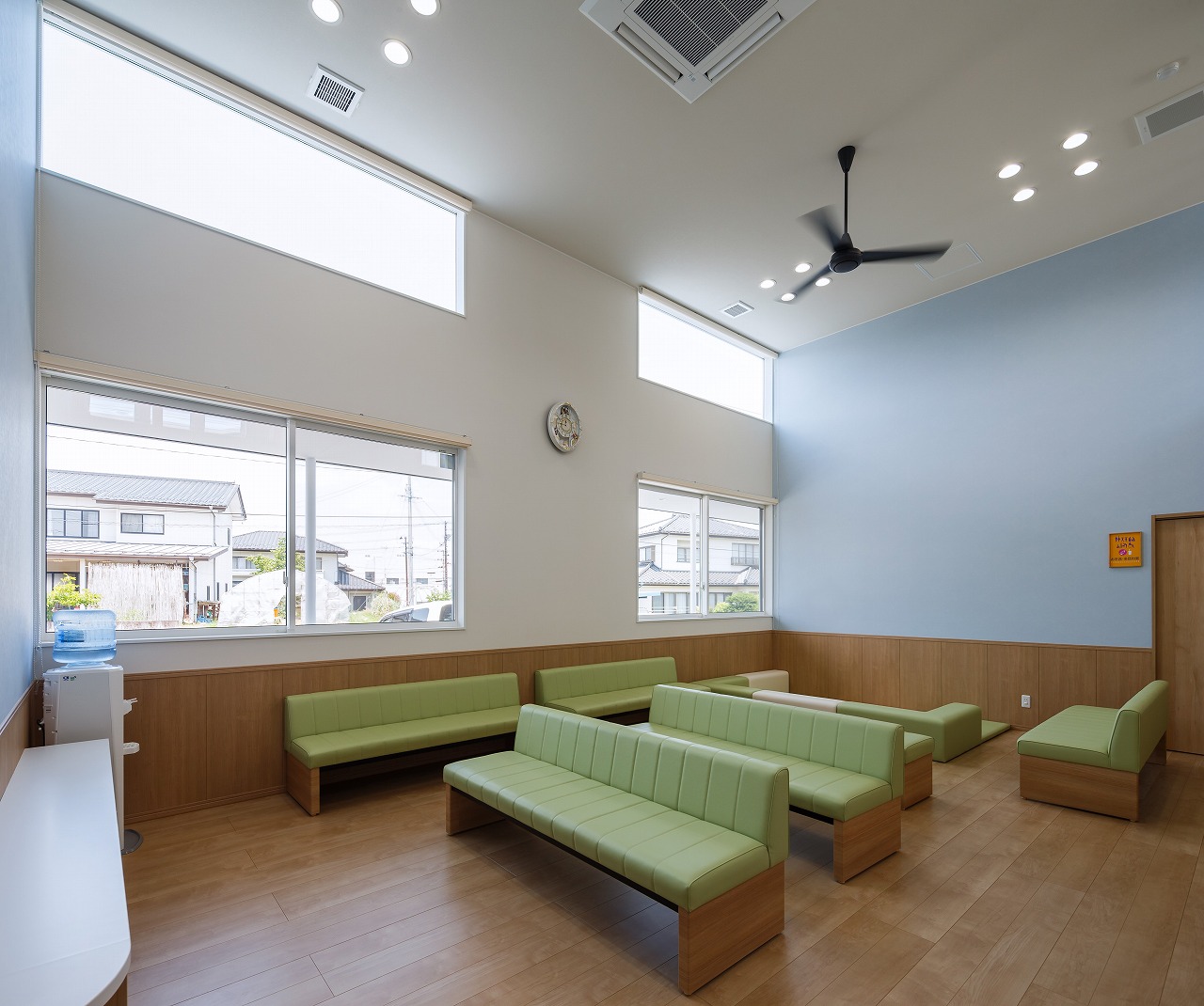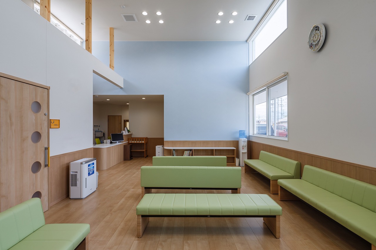 北側道路に面する立地条件を活かし、待合室にはあえて北側からの柔らかな自然光を取り込む計画としました。一般的に南面採光が採用されることが多いが、実際の医療施設では眩しさによりカーテンが閉じられるケースも少なくありません。そこで本計画では安定した光環境を重視し、落ち着いた待合空間を実現しています。