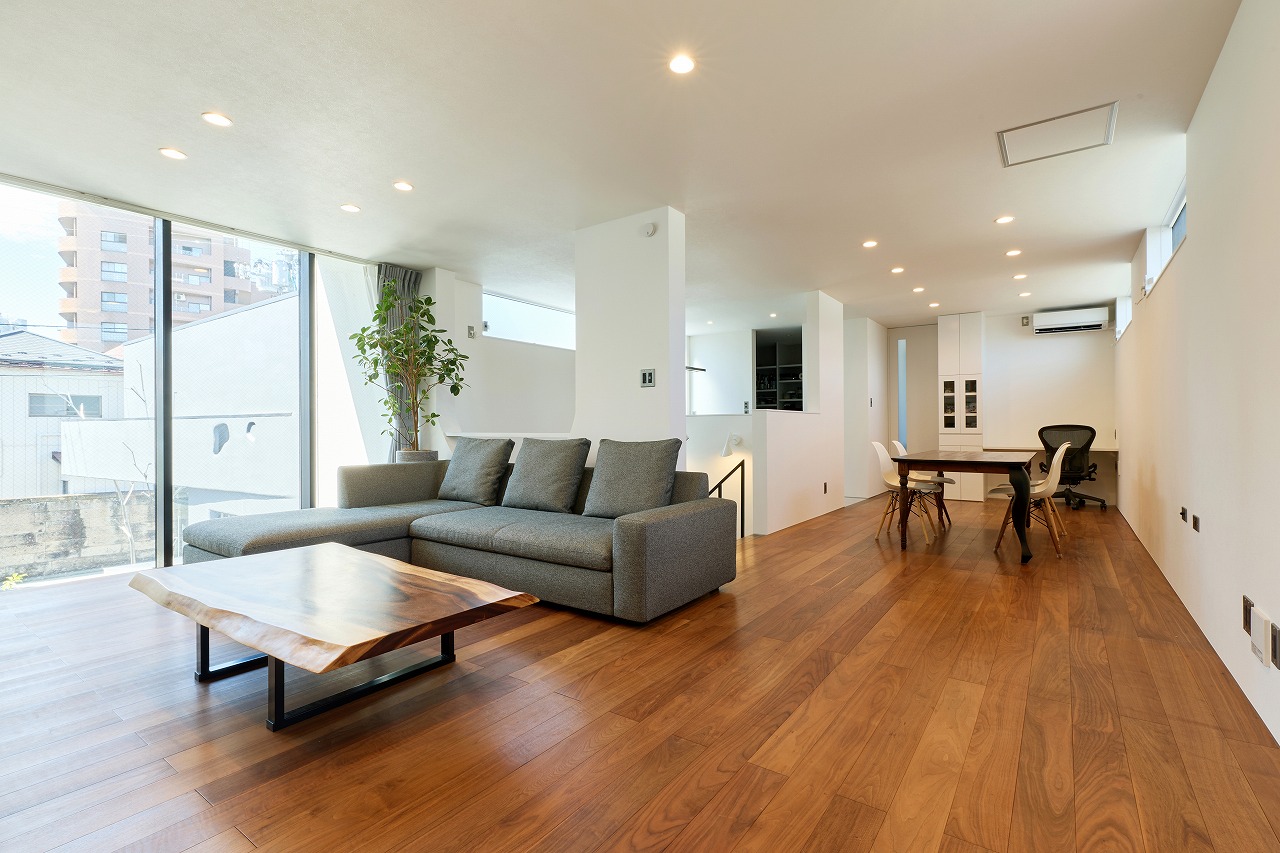 以前吹き抜けだったところに床を張り増築し、広々としたLDKのワンルームとしています。
