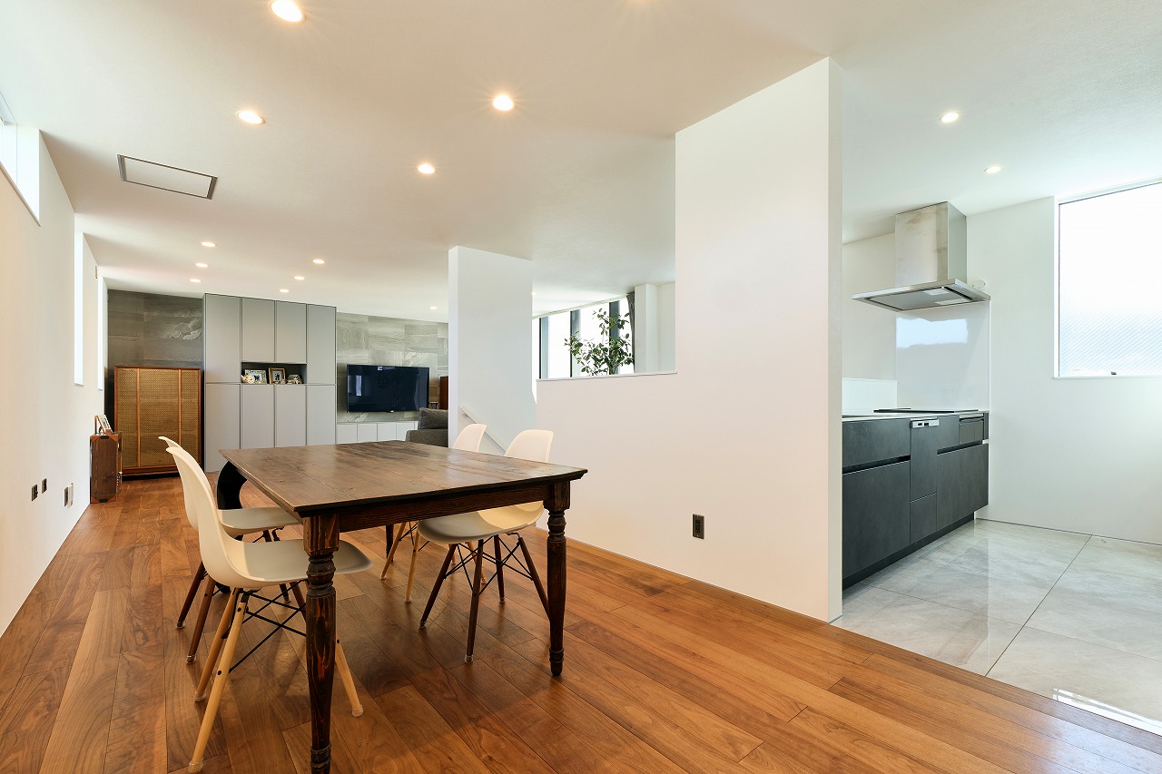 壁付けのキッチン上部を開放することで既存階段スペースも含めて視線が抜けるように工夫しています。